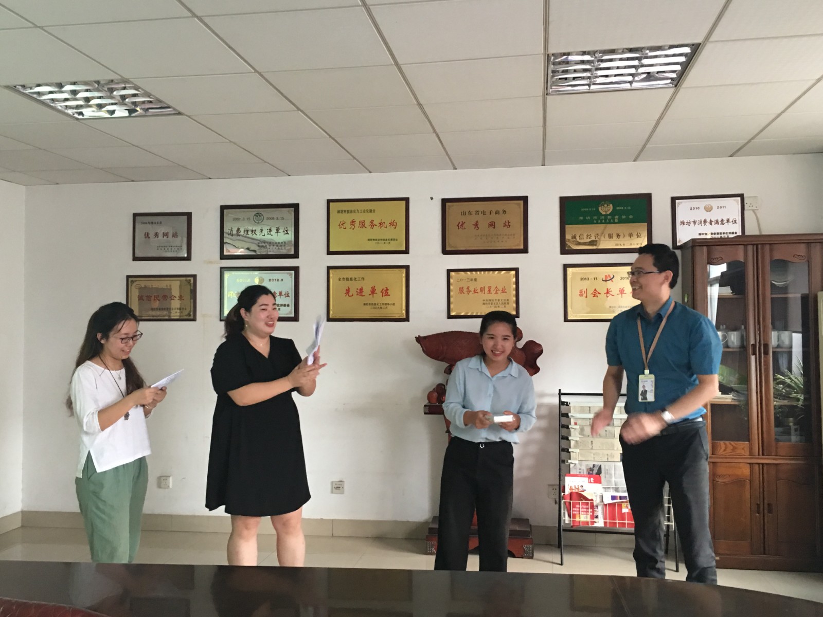 8月份積分游戲前三名獲獎?wù)呃顣孕?、李江玲、代凱利分別由王翠萍總經(jīng)理、趙耀副總經(jīng)理、王杰副總經(jīng)理給獲獎?wù)哳C發(fā)獎品